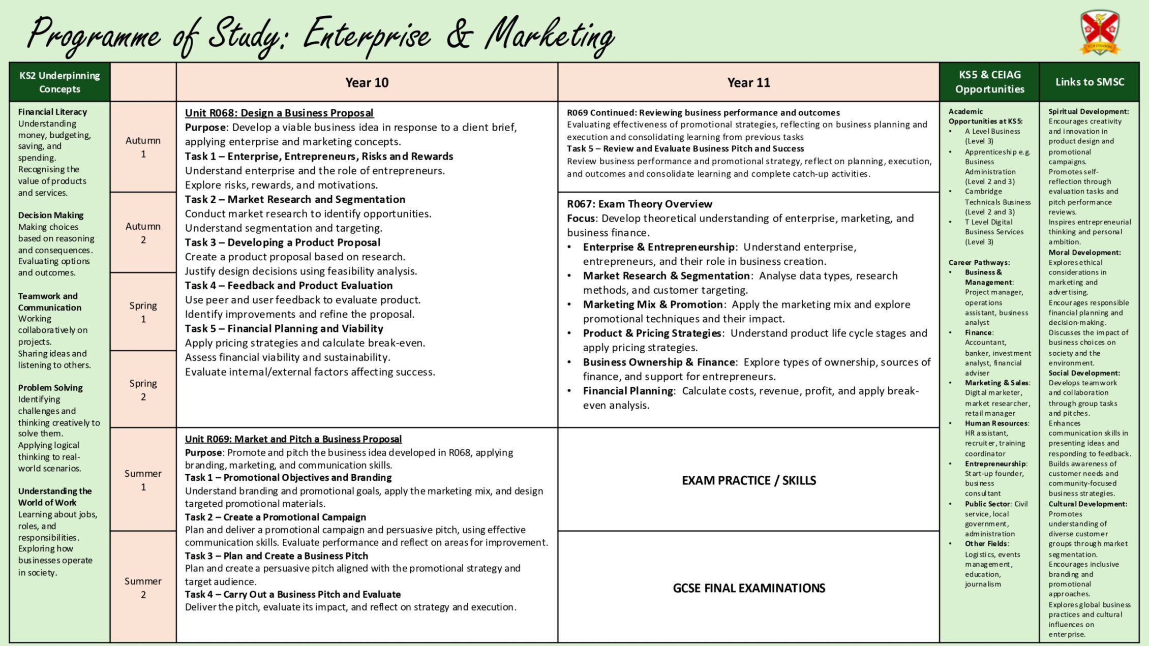 Our aim is that every pupil leaves Enterprise and Marketing equipped to make informed choices, act with integrity, and understand how business can be a force for positive change in their lives, communities, and the wider world.
