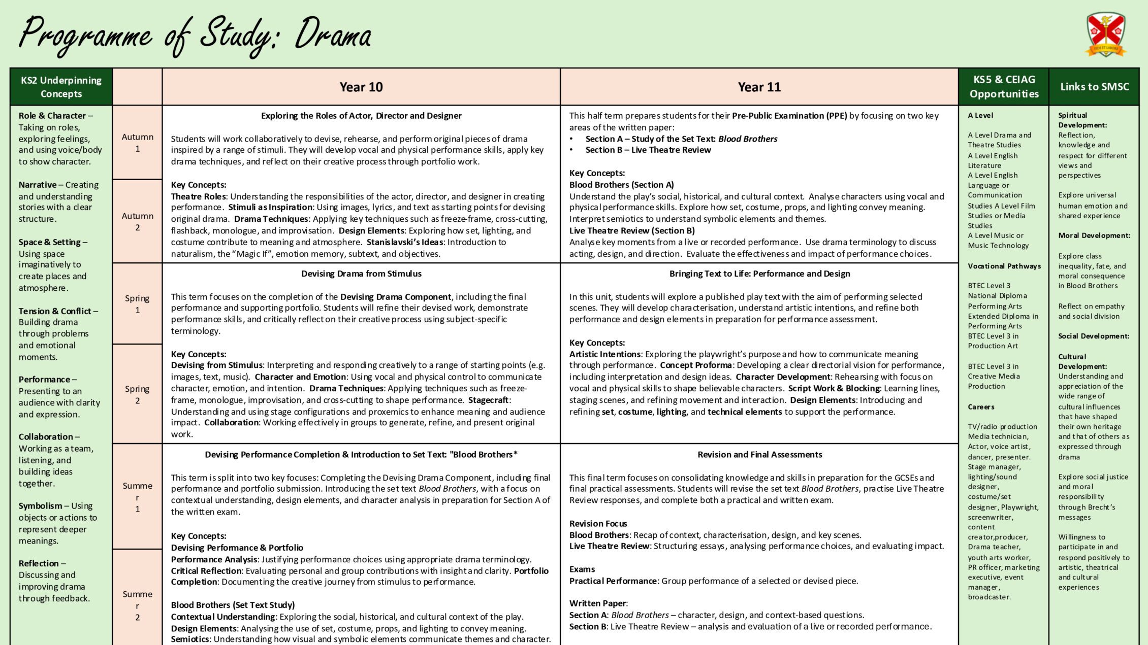 Our Drama curriculum provides a safe, inclusive and supportive environment where pupils are encouraged to grow in confidence, creativity and compassion. Rooted in Gospel values such as dignity, community and expression of the self, drama offers pupils the opportunity to explore their identity, develop empathy for others, and find their voice, both individually and in collaboration with others.